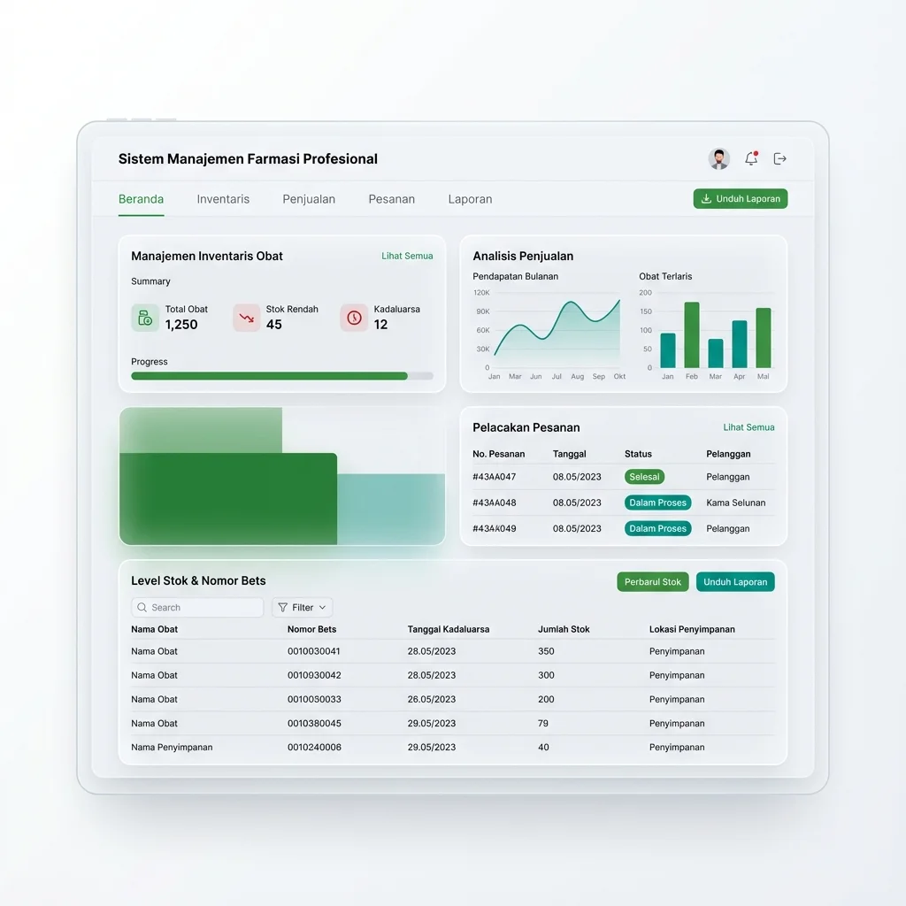 Kelola distribusi obat, stok, penjualan, dan kepatuhan regulasi dalam satu platform modern. Solusi lengkap untuk Pedagang Besar Farmasi dan Apotek di Indonesia.